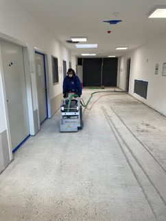 Abschließend wurden Restanhaftungen des Estrichs von der Bodenplatte mittels schwerer Fräse unter Direktabsaugung des Hochleistungssauganhängers entfernt.